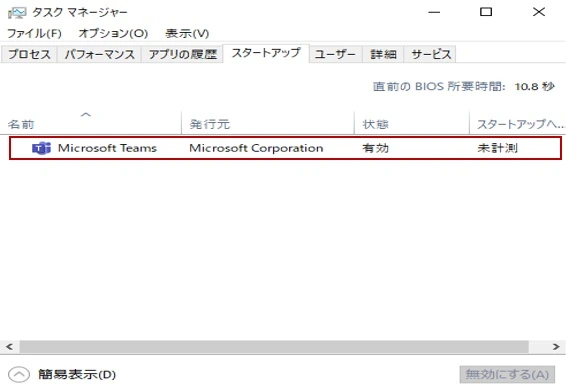 PC起動時にTeamsが起動するのを止めたい場合は、スタートアップの一覧からTeamsを外す必要があります。