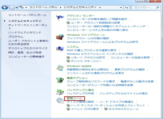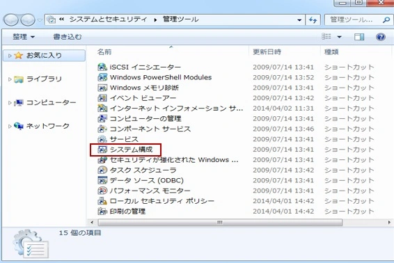 Windows7の場合は、【コントロールパネル→システムとセキュリティ→管理ツール】の順に進み、一覧の中の【システム構成】を開いて、【スタートアップ】のタブを選択。