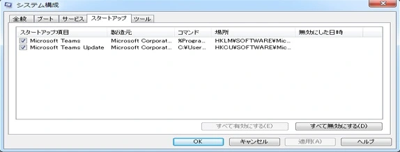 その後、「Microsoft Teams」と「Microsoft Teams Update」をスタートアップの一覧から外してください。
